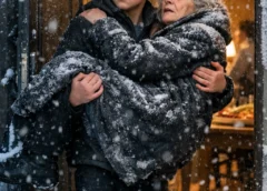 Jake was standing just inside the doorway, his arms wrapped tightly around an elderly woman. She looked about seventy, maybe a little more. Snow clung to her thin gray hair and soaked the shoulders of her coat. Her whole body was trembling, not just from the cold, but from something deeper—panic, confusion, exhaustion. Her eyes were wide and unfocused, darting around the room like she didn’t understand where she was.