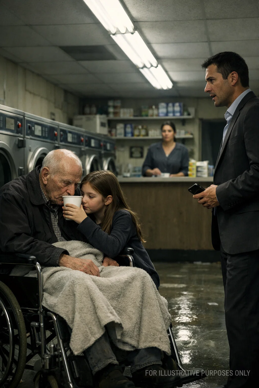 Near the folding tables, between humming washing machines, sat a teenage girl with her sleeves rolled up, her hair pulled back into a loose knot, one arm wrapped protectively around an elderly man slumped beside her in a wheelchair, his head resting against her shoulder as she spoke to him in a low, steady voice that sounded less like instruction and more like reassurance.
