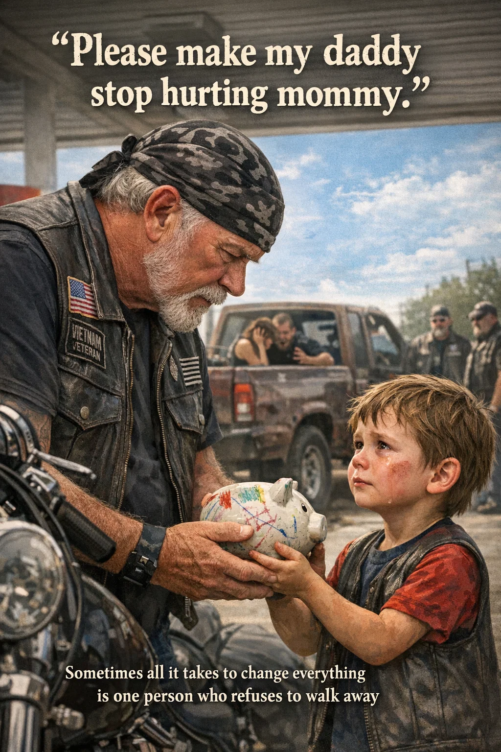 It happened on an ordinary afternoon at a gas station, the kind of place people pass through without remembering, until a moment turns it into something permanent. I had just finished fueling my motorcycle when I felt a light tug on my leather vest. I turned and saw a little boy, no older than five, holding a chipped ceramic piggy bank covered in crayon scribbles. His hands were shaking. His face was streaked with tears. Then he said the six words that stopped time: “Please make my daddy stop hurting mommy.”