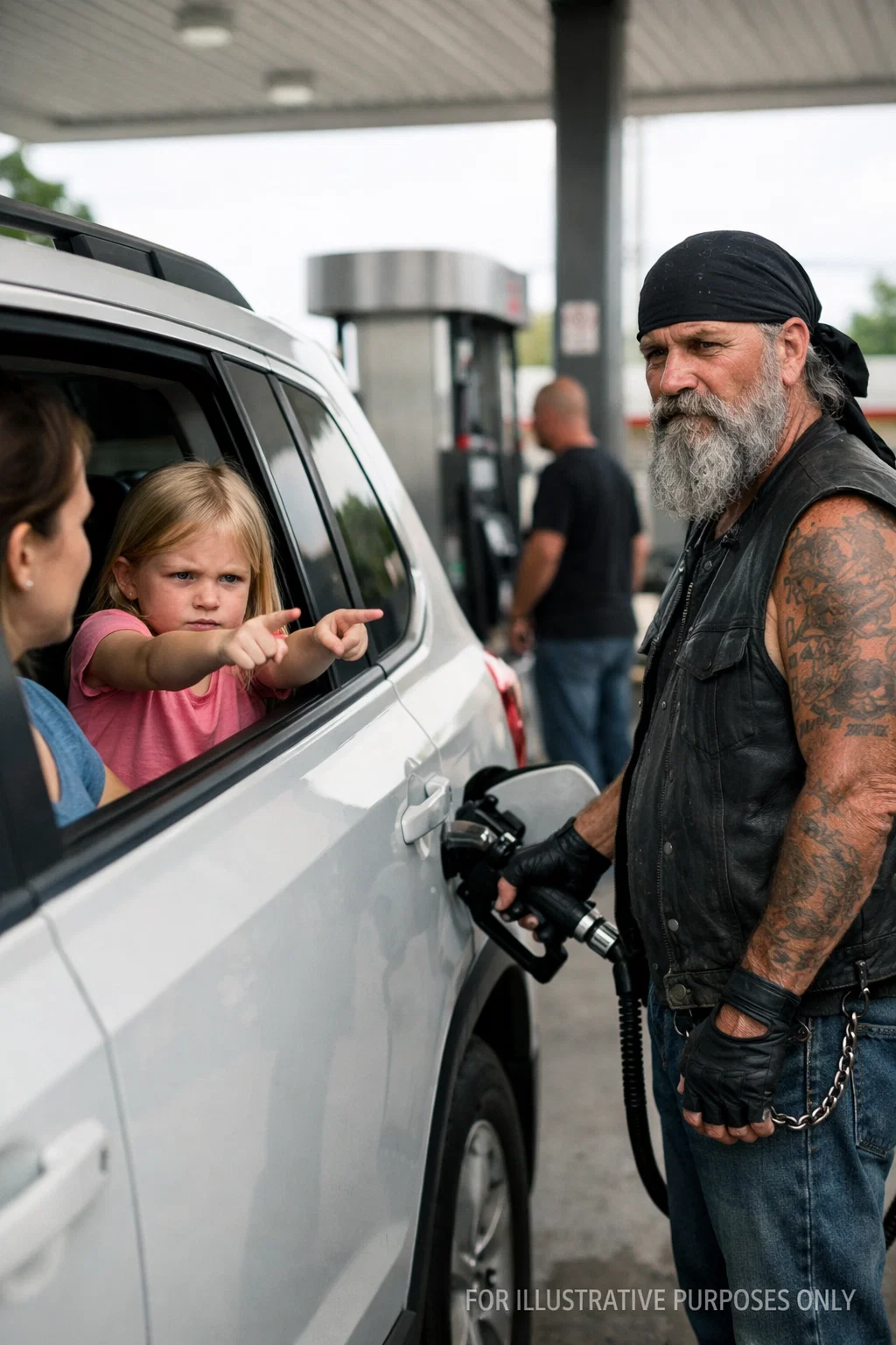 She sat silently in the back seat of a white SUV as a Wyoming blizzard swallowed the highway — until a little girl looked at a tattooed biker