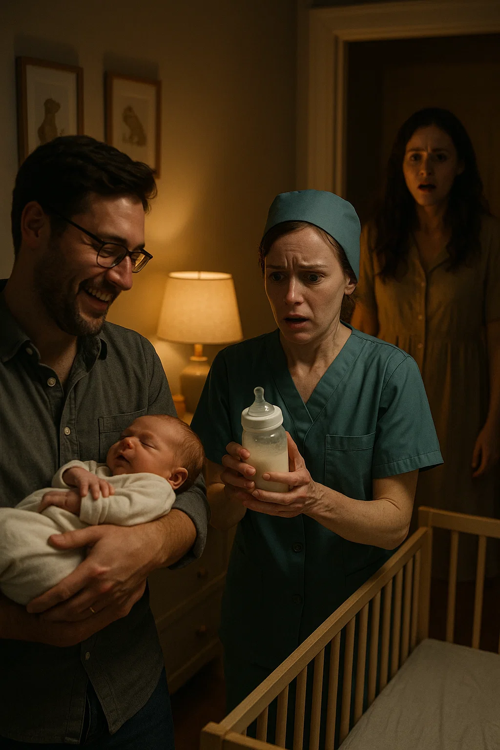 The nursery smelled faintly of lavender and powder, the soft hum of the white-noise machine lulling my newborn into sleep. I had finally convinced myself to rest for a few minutes when Mia, the baby nurse we’d hired, stepped into the room. She was calm as always, her gentle voice promising she would watch over him while I napped. I trusted her instantly—after weeks of sleepless nights, she had become a lifeline. But later that evening, when my husband walked in and lifted our baby into his arms, I saw something I’ll never forget. Mia’s face went pale, her body stiff, her hands trembling so violently she nearly dropped the bottle she was holding. And in that moment, I knew something was terribly wrong.