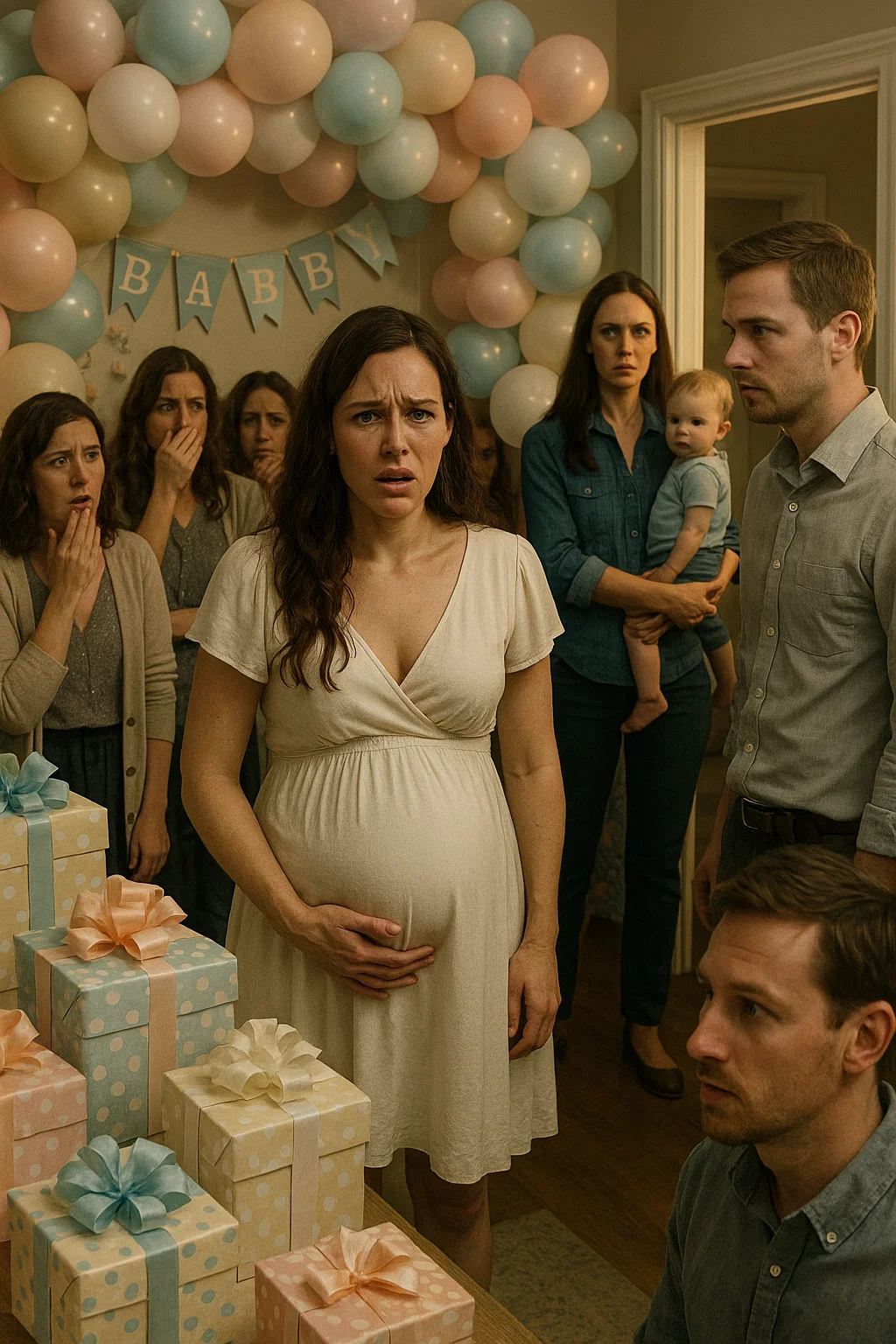 The living room was decorated in pastel blues and soft gold, balloons tied to every chair, tiny cupcakes lined neatly on trays. I wore a flowing white dress, my hands resting on my round belly as laughter filled the space. It was my baby shower, the day meant to celebrate the little life growing inside me. My mother fussed over the decorations, my friends passed me gifts wrapped in silver paper, and my husband, Adam, hovered proudly, snapping photos of everything. For a few hours, I felt like the luckiest woman alive. Until the doorbell rang.