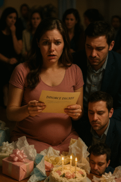 The guests gasped, shifted uncomfortably, some standing to leave. My best friend reached for me, but I pulled away, clutching the envelope like it might explode. Tears blurred the words, but I saw enough—the date filed, the signature, his name. This wasn’t sudden. He had planned this. Prepared this. Packaged it as a gift for the mother of his child.