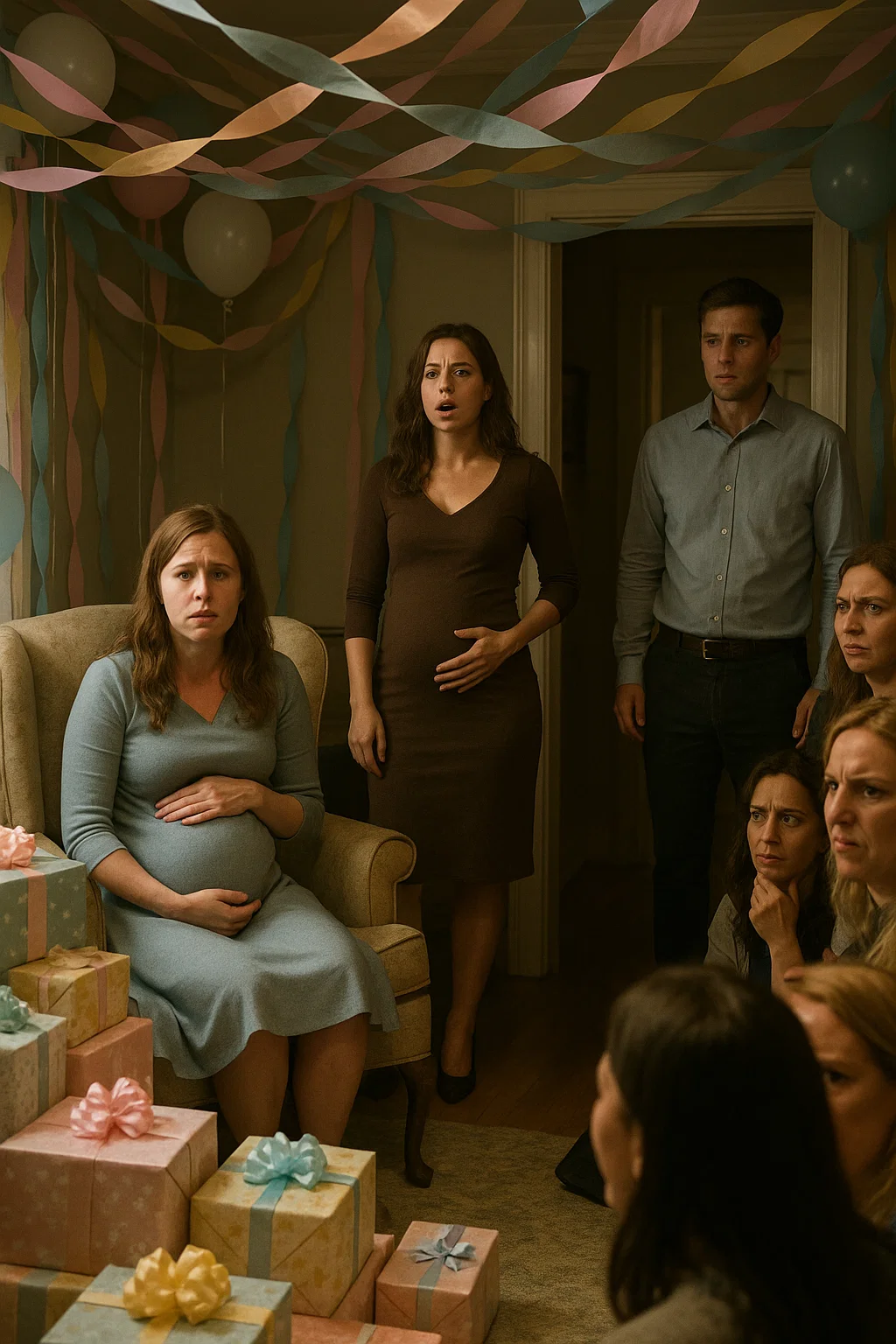 She walked in without hesitation. Tall, sharp-featured, her hand resting on a rounded belly. The air shifted instantly, conversations faltering. I froze, wrapping paper still in my hands. My mother frowned. “Can I help you?” she asked carefully. The woman’s eyes landed on Alex. His face drained of color. And then she said it: “I thought everyone should know—I’m pregnant too. And it’s Alex’s.”