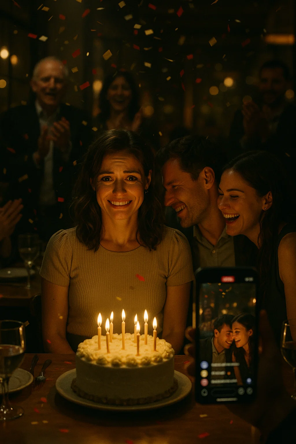 We walked into the restaurant, and suddenly—surprise! Cameras flashed, confetti cannons burst, and a crowd of friends and family shouted my name. My heart leapt. It was perfect—at least for the first few seconds.