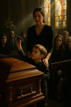 The child looked no older than five. Dark hair, the same sharp jawline my brother had. His small hands clutched a woman’s skirt—her eyes red, her face pale as she tried to steady him. Whispers swept through the pews like wind through dry leaves. “Who is that?” “Do you know her?” “Is she family?” My mother’s voice cracked. “That boy… he has his eyes.” The woman stepped forward, trembling, guiding the child closer to the coffin. And then, with a voice too innocent to understand the weight it carried, the boy whispered, “Goodbye, Daddy.”