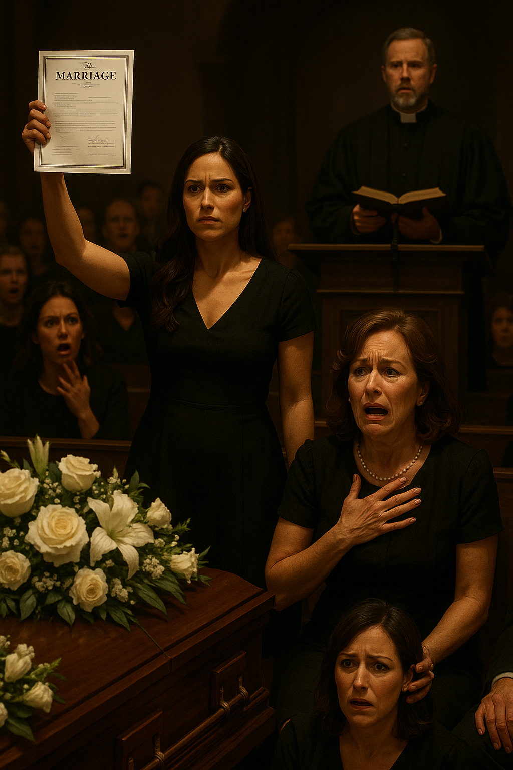 The woman stood by the casket now, her hand resting gently on the wood. “I was married to him. For twelve years. Quietly. Privately. He promised to tell you all one day.”