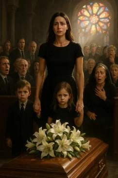 The climax hit in the stunned silence of the funeral as the woman led her children to the front pew. “He promised me a life,” she said softly, staring at the casket. “He promised us everything.” My mother-in-law let out a strangled cry, collapsing against her son. The room erupted in chaos—some people shouting at the woman to leave, others whispering in shock. My husband stood rigid, torn between fury and disbelief.