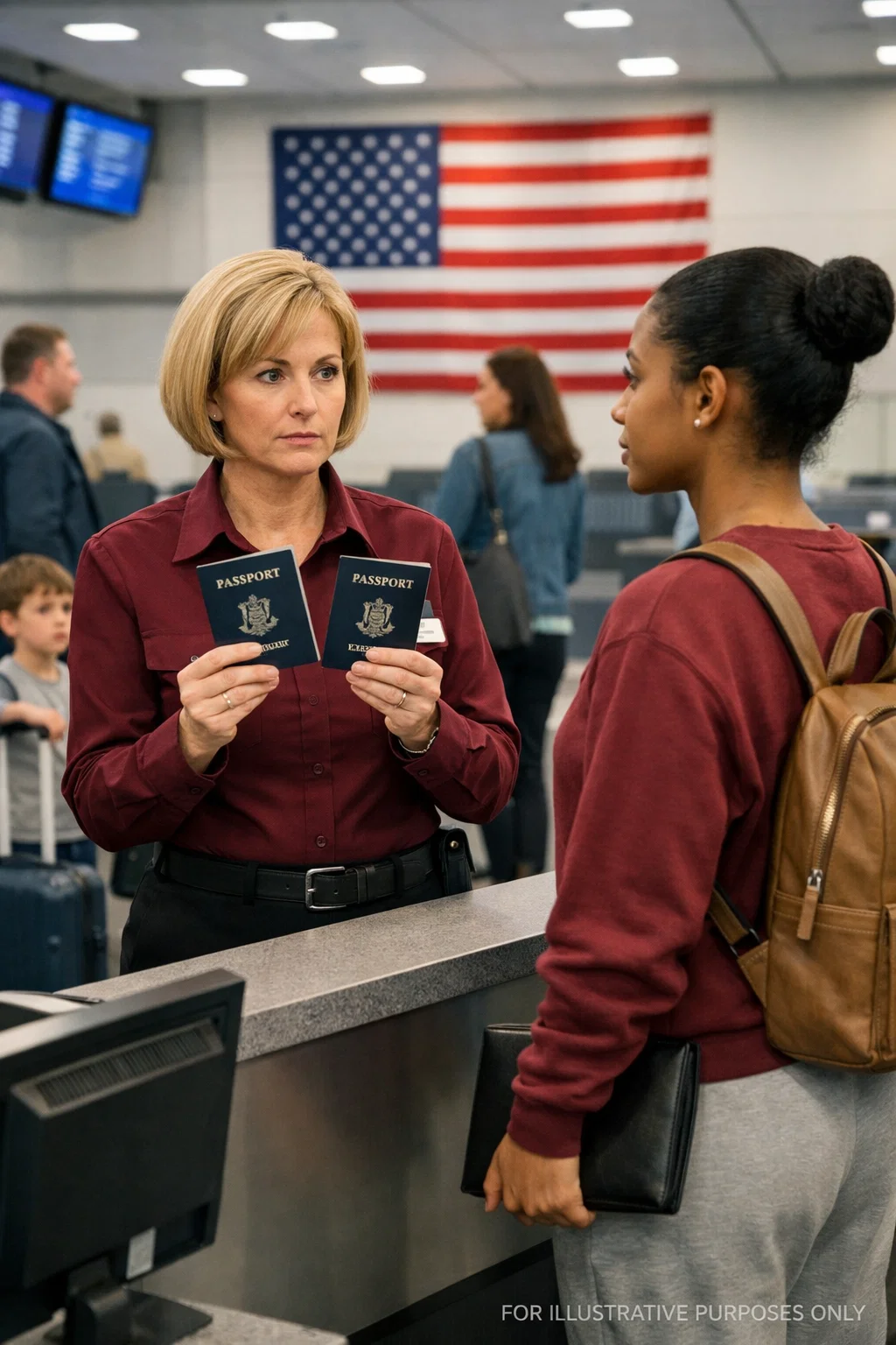 Brenda glanced at the boarding pass, then at Ebony, then at the passport. Her eyes, cold and assessing, traveled from Ebony’s simple sweatshirt down to her sneakers and back up to her face. The fake smile she’d given the family moments before had vanished, replaced by a flat, challenging stare.