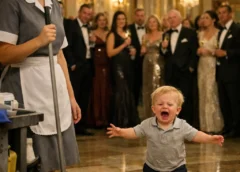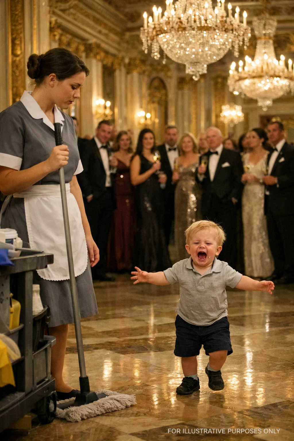 The crystal glasses still vibrated when silence fell across the grand hall. Fifty high-society guests turned, confused, toward the same scene: Matías, the two-year-old son of a wealthy hotel magnate, was running across the marble floor, red-cheeked from crying, straight into the arms of… the maid.