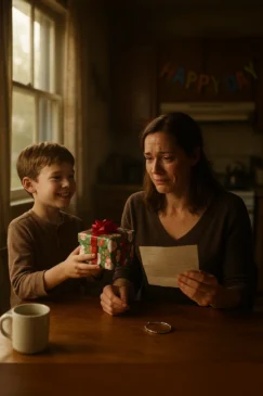 It was supposed to be a simple birthday morning. I woke to the smell of pancakes and the sound of my eight-year-old son, Lucas, clattering around in the kitchen. He was always so determined when he wanted to surprise me, even if it meant leaving flour dust on the counters and eggshells in the sink. I smiled to myself, grateful, as I walked in and saw him standing there proudly with a small wrapped box in his hands.